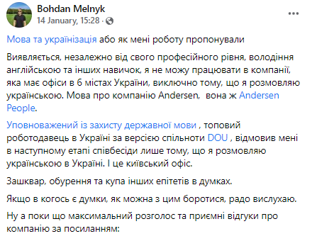 Конфликт на языковой почве возник на днях, когда киевлянин Богдан Мельник рассказал о том, что Andersen People отказала ему в трудоустройстве. Об этом он пожаловался на своей странице в Facebook.