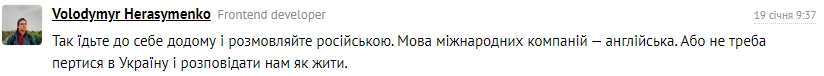 "Так езжайте к себе домой и разговаривайте на русском. Язык международных компаний - английский. Или не надо переться в Украину и рассказывать нам как жить".