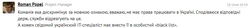То есть в Украине из-за русского языка начали травить IT-компанию, которая дает в стране рабочие места. Вероятно, если бы прозвучало требование говорить в команде по-английски, то такой скандал вряд ли бы произошел.