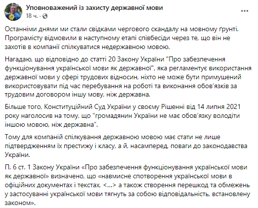 "Проблема, полагаем, в том, что у кандидата сложилось впечатление, якобы в компании не разговаривают на украинском языке. Хоть на самом деле речь шла про международную команду отдельно взятого проекта", - заявил он.