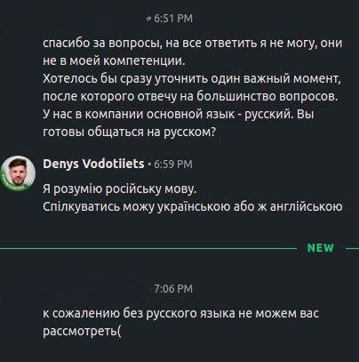 Это произошло после слов соискателя о том, что "в русскоязычном коллективе принципиально будет общаться на украинском языке". После чего работодатель прекратил дальнейшее общение.