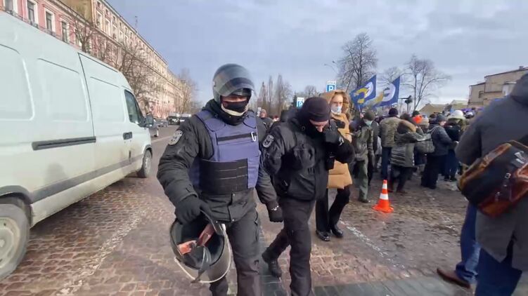 Правоохранители пытались отобрать у сторонников Порошенко бочки, дрова и буржуйки. Они оттесняли участников акции от палаток, которые они установили перед зданием Печерского суда.