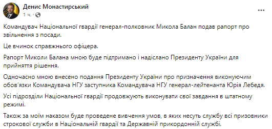 "Рапорт Николая Балана мною будет поддержан и направлен Президенту Украины для принятия решения. Одновременно с эти мною внесено представление Президенту Украины о назначении исполняющим обязанности Командующего НГУ заместителя Командующего НГУ генерал-лейтенанта Юрия Лебедя", - написал Монастырский.