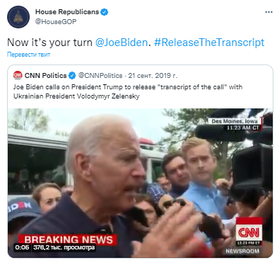 "Теперь твоя очередь, Джо Байден. Публикуй стенограмму", — говорится в заявлении республиканцев.
