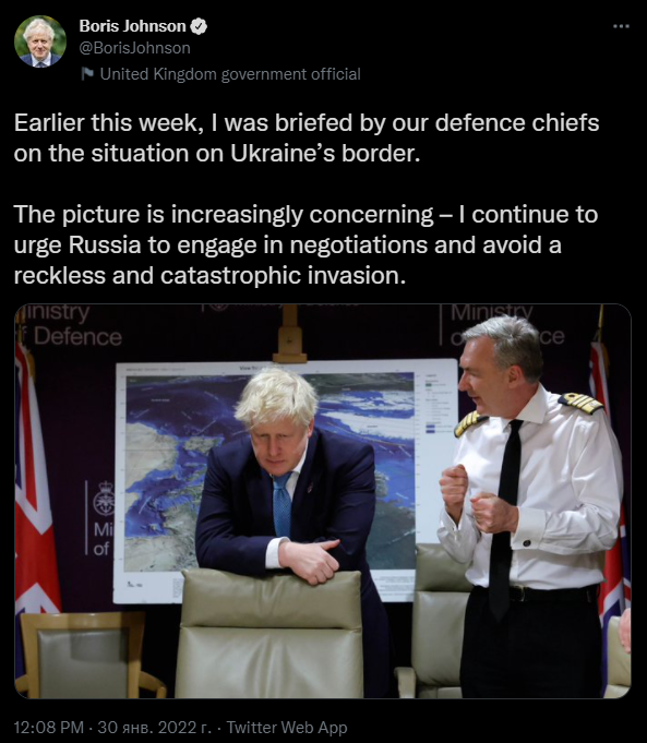 "Ранее на этой неделе начальники наших оборонных ведомств проинформировали меня о ситуации на границе с Украиной. Картина становится все более тревожной - я продолжаю призывать Россию к переговорам и избеганию безрассудного и катастрофического вторжения", - написал Борис Джонсон.
