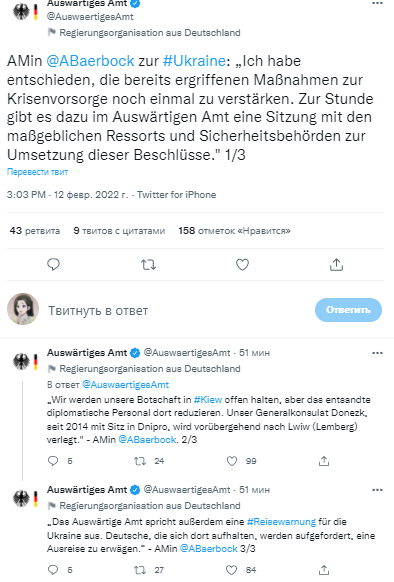 По словам Бербок, она приняла решение усилить уже принятые ранее меры по предотвращению кризиса на Украине. Министр добавила, что в МИД ФРГ проходит совещание с участием представителей других ведомств и сил безопасности.