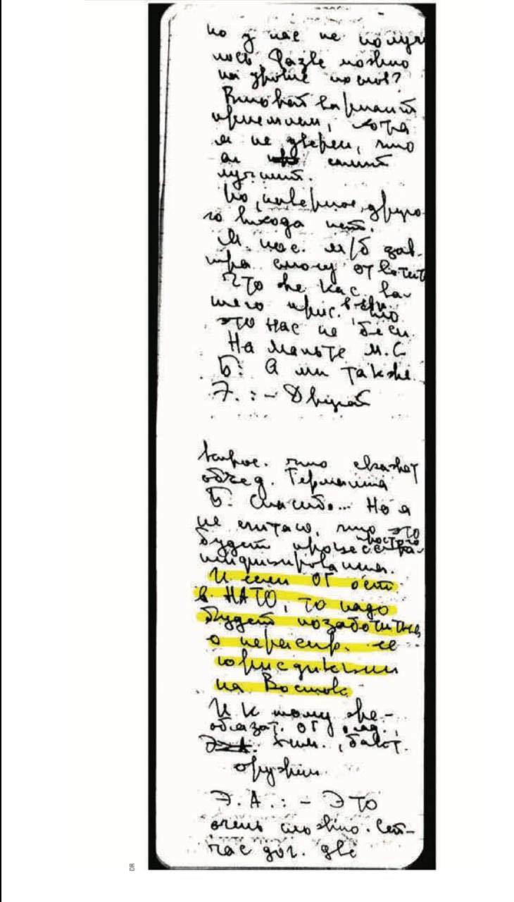 Например, факсимиле записи беседы министра иностранных дел СССР Шеварнадзе и госсекретаря Бейкера от 12 февраля 1990 года. Запись вел помщник Шеварнадзе Теймураз Мамаладзе. Бейкер заявил: "Если объединенная Германия остается в НАТО, то надо будет позаботиться ее нераспространении его (альянса) юрисдикции на Востоке. И к тому же обязательства Германии по химическому и биологическому оружию".