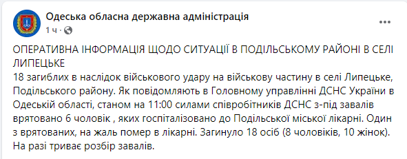 По данным местной власти, 18 человек погибли в результате удара по воинской части в селе Липецкое, Подольского района.