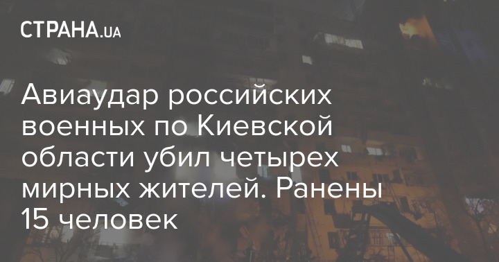 В результате авиаудара со стороны России в Киевской области погибли четверо мирных жителей и ранены 15. Об этом сообщает сайт Киевской ОГА.