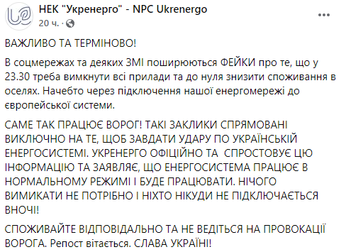 Укрэнерго назвало фейком информацию, которая распространяется в соцсетях, о том, что в 23:30 якобы нужно выключить все приборы и до нуля снизить потребление в домах якобы через подключение нашей энергосети к европейской системе.