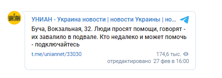 Под Киевом в Буче, где сегодня была замечена российская военная техника, в подвале дома на Вокзальной, 32 люди просят помощи. По данным УНИАН, они оказались под развалинами. Среди заблокированных в подвале есть дети.
