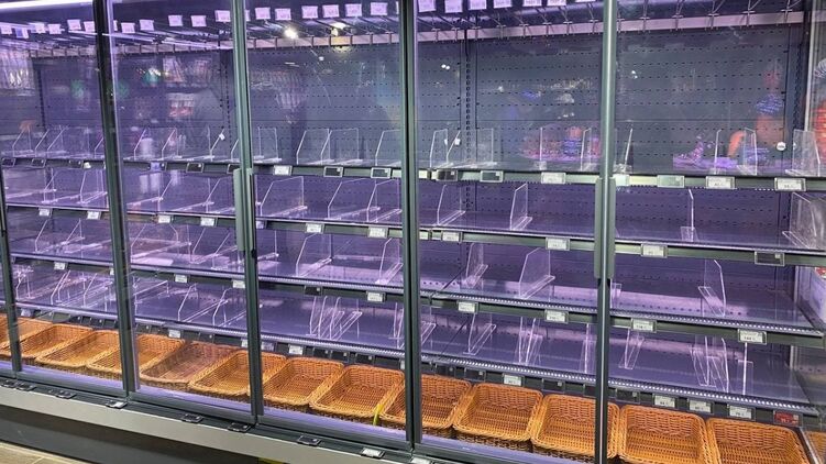 В магазинах Киева - большие проблемы с продуктами. Пустые полки с хлебом и колбасными изделиями. Кроме того, огромные очереди при входе в супермаркеты (те из них, которые работают).