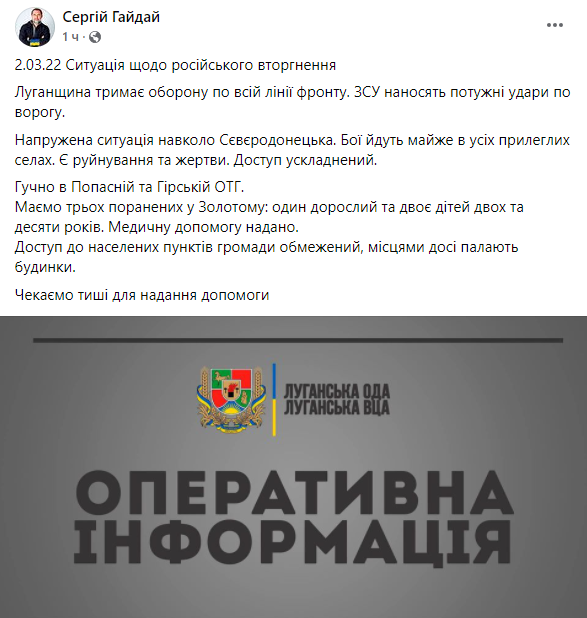 "Напряженная ситуация вокруг Северодонецка. Бои идут почти во всех близлежащих селах. Есть разрушения и жертвы. Доступ усложнен. Громко в Попасной и Горской ОТГ", - сообщил Гайдай.