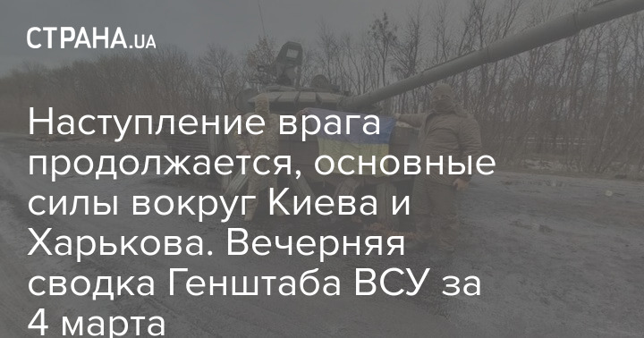 Согласно данным на 24:00 пятницы, 4 марта, российские войска продолжают вести наступательную операцию в Украине. Основные силы оккупантов сосредоточены на окружении Киева и Харькова.