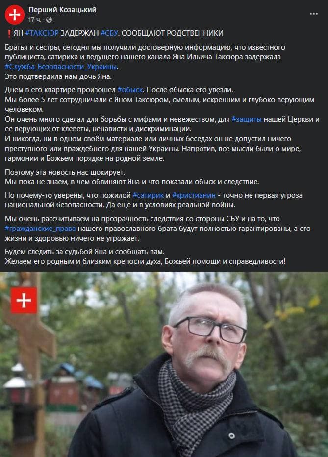 Сотрудники Службы безопасности Украины задержали украинского писателя Яна Таксюра. Об этом сообщает "Перший Козацький" (Таксюр - ведущий на этом канале).