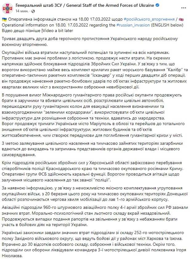 Оккупанты потеряли наступательный потенциал по всем направлениям. Об этом по итогам четверга, 17 марта, сообщает Генеральный штаб ВСУ в ежедневной сводке на своей странице в Facebook.