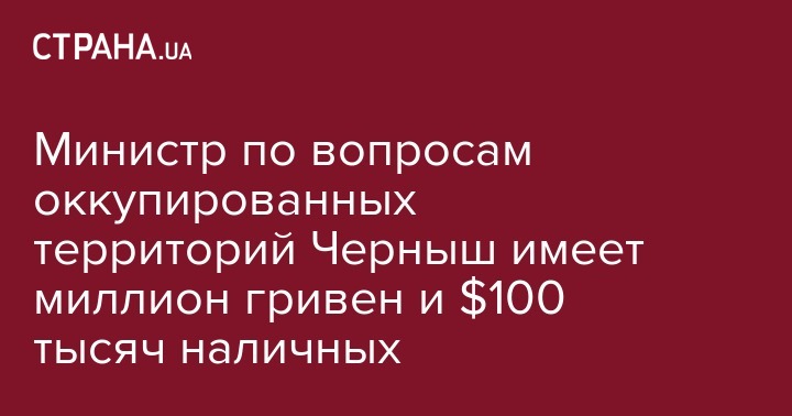 Министр по вопросам временно оккупированных территорий и внутренне перемещенных лиц Вадим Черныш задекларировал 900 тысяч гривен, 40 тысяч евро и 118 тысяч долларов наличных средств в 2015 году. Также он указал доли жены в шести компаниях.
