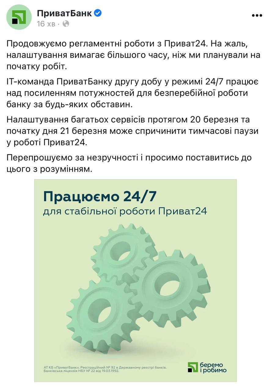 Регламентные работы в системе ПриватБанка "Приват24", о которых было заявлено вчера, затянулись и до сих пор не закончены.