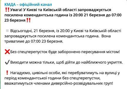 В Киеве и Киевской области снова объявили о введении "суточного" комендантского часа. Выходить из дома будет запрещено с 20:00 21 марта до 07:00 23 марта. Об этом сообщает КГГА.