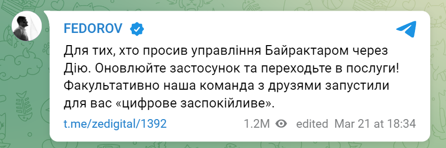 В новой версии, которую можно получить с обновлением приложения, появилась игра - "єБайрактар". Об этом написал министр цифровой трансформации Михаил Федоров и назвал ее "цифровым успокоительным".