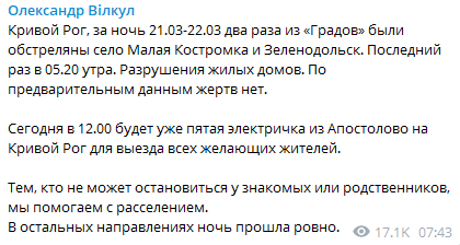 "Кривой Рог, за ночь 21.03-22.03 два раза из "Градов" были обстреляны село Малая Костромка и Зеленодольск. Последний раз в 05:20 утра. Разрушения жилых домов. По предварительным данным жертв нет", - написал Вилкул в Telegram-канале.