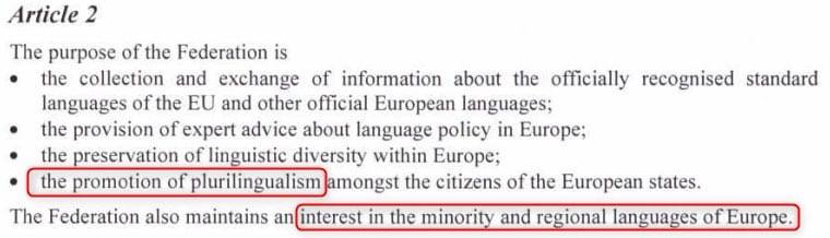 Отметим, что эта федерация в своих официальных документах пишет, что ее цель - "продвижение многоязычия". А также защита языков меньшинств. Цель организации - изучение языковой обстановки в конкретной стране и рекомендации, что нужно делать.