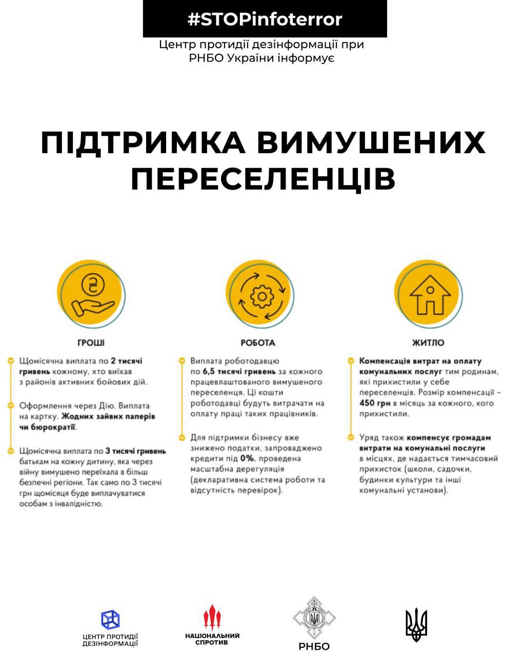 08.56 Центр противодействия дезинформации при СНБО Украины разъясняет, по каким направлениям, согласно решению правительства, вынужденные переселенцы могут получить государственную помощь: