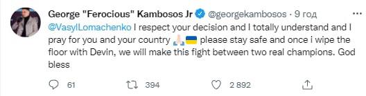 "Василий Ломаченко, я уважаю твое решение и полностью понимаю его. Я молюсь за тебя и твою страну. Пожалуйста, оставайся в безопасности. И однажды, когда я вытру пол Девином Хэйни, мы проведем бой между двумя настоящими чемпионами. Благослови тебя Бог", - написал Камбосос в Twitter.