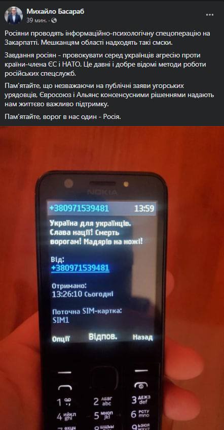 Басараб пишет, что эти смски рассылаются агентами российских спецслужб, чтобы спровоцировать среди украинцев агрессию против венгров и Венгрии.