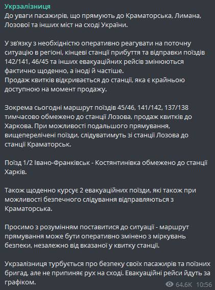 "В связи с необходимостью оперативно реагировать на текущую ситуацию в регионе, конечные станции прибытия и отправки поездов 142/141, 46/45 и другие эвакуационные рейсы меняются фактически ежедневно, а иногда и чаще", - сообщают в УЗ.