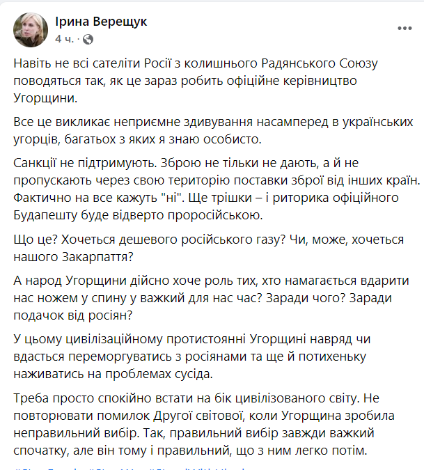 Вице-премьер Украины Ирина Верещук подвергла критике Венгрию за отказ поддержать санкции против России, а также высказала подозрения, что венгерские власти якобы желают присоединить Закарпатскую область Украины, которая в прошлом входила в состав Австро-Венгерской империи.