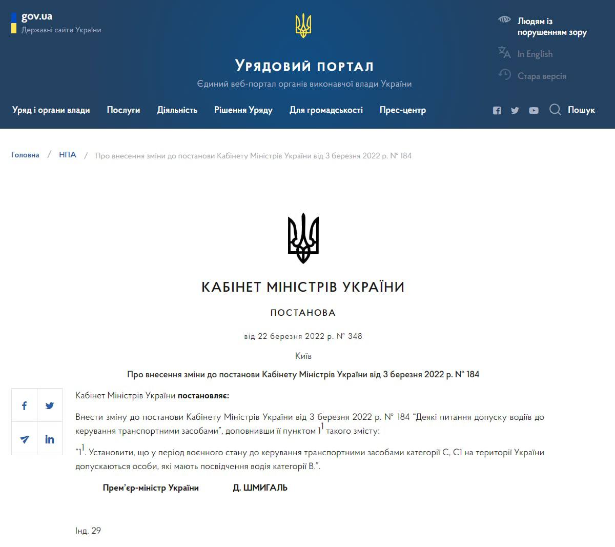 "Установить, что в период военного положения к управлению транспортными средствами категории С, С1 на территории Украины допускаются лица, имеющие водительские удостоверения категории В", - говорится в постановлении правительства.