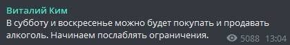 "В субботу и воскресенье можно будет покупать и продавать алкоголь. Начинаем послаблять ограничения", - сообщил Ким.