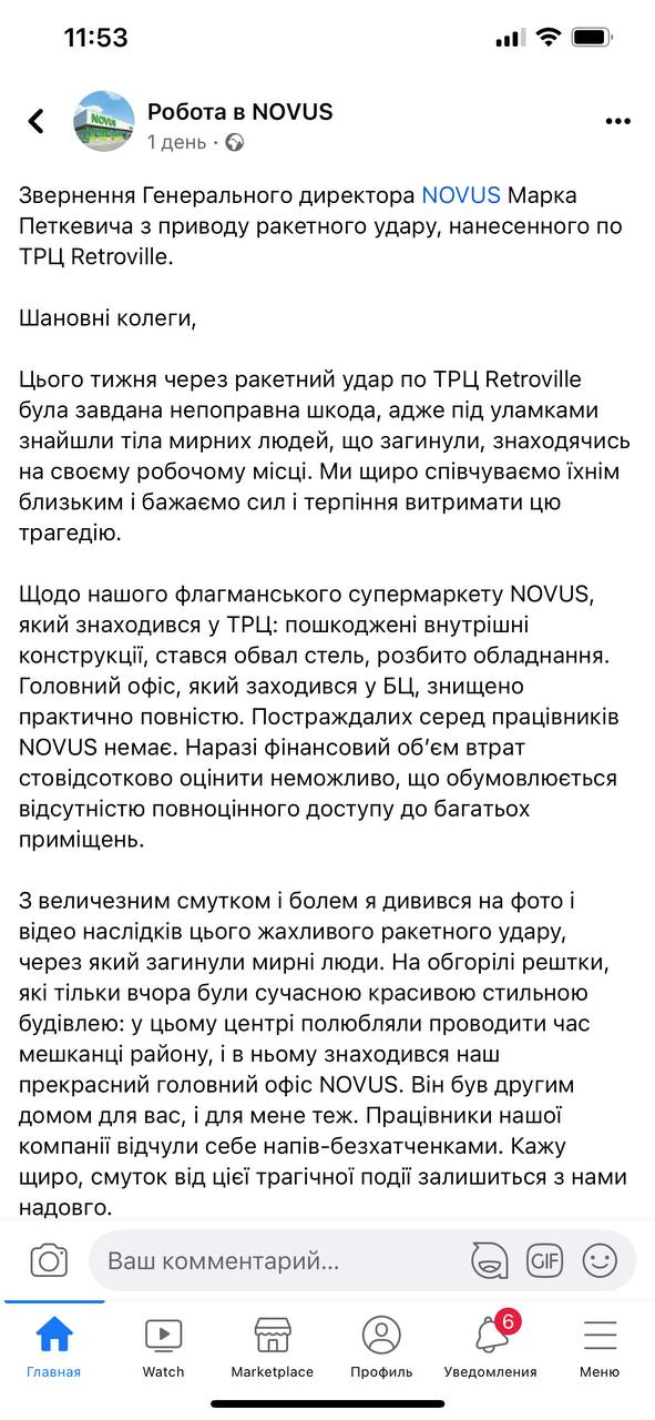 Из-за ракетного удара российских войск по ТРЦ в Киеве 20 марта был уничтожен главный офис компании "Novus Украина".