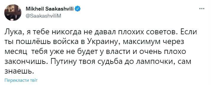 "Лука, я тебе никогда не давал плохих советов. Если ты пошлёшь войска в Украину, максимум через месяц тебя уже не будет у власти и очень плохо закончишь. Путину твоя судьба до лампочки, сам знаешь", - написал Михаил Саакашвили.