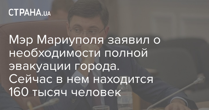 Мэр Мариуполя Вадим Бойченко заявил о необходимости полной эвакуации города. По словам Бойченко, на сегодняшний день в городе находится около 160 тыс. человек.