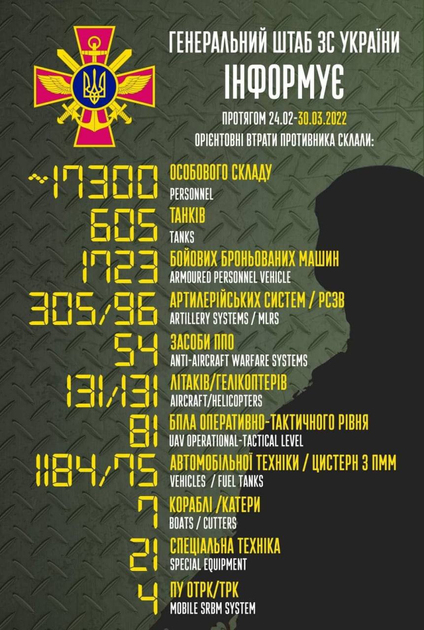 В Генштабе ВСУ обновили информацию относительно потерь вражеской российской армии за время войны с 24 февраля по 30 марта.