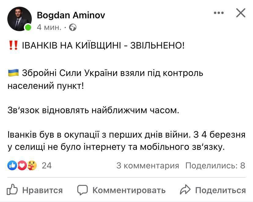 Журналист Богдан Аминов сообщает, что ВСУ освободили пгт Иванков (80 километров к северу от Киева, около Чернобыльской зоны).