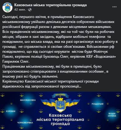 "Сегодня, 1 апреля, в помещение Каховского горисполкома вошло несколько десятков вооруженных военных Российской Федерации вместе с некоторыми местными жителями. Всех работников горисполкома, которые на то время были на рабочих местах, собрали в зале заседаний, отобрали мобильные телефоны и сообщили, что городская власть, которая в настоящее время организует всю работу в общине, не справляется со своими обязанностями", - говорится в сообщении.