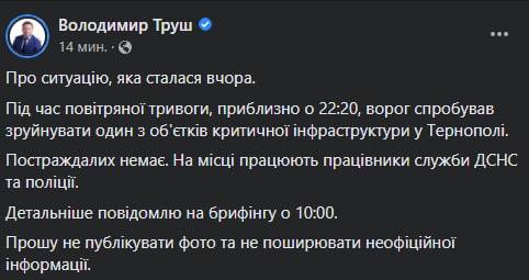 "Враг попытался разрушить один из объектов критической инфраструктуры. Пострадавших нет. На месте работают сотрудники службы ГСЧС и полиции... Прошу не публиковать фото и не распространять неофициальную информацию", - написал Труш.