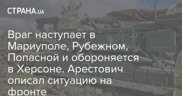 • Самые ожесточенные бои на юго-западе Луганской области - Рубежное, Попасная, Северодонецк. Противник также развивает наступление из Изюма на юг, к Краматорску и Славянску, а также от Угледара к Марьинке. "Это попытка окружить наши войска, но я думаю, эта попытка будет напрасной, слишком неспособствующая обстановка для противника", - говорит Арестович.
