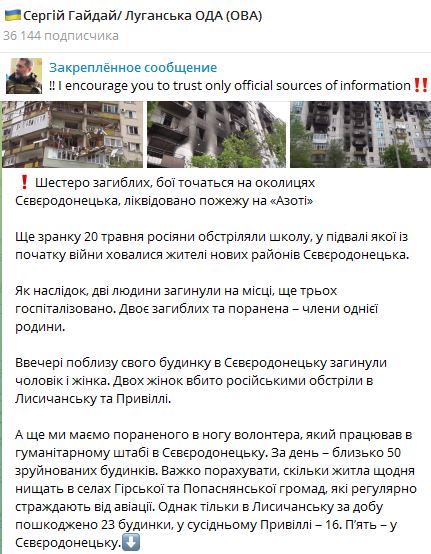 5. Из городов Лисичанск, Северодонецк, Рубежное, Кременная и поселка Горное в Луганской области сегодня удалось эвакуировать 1507 человек.