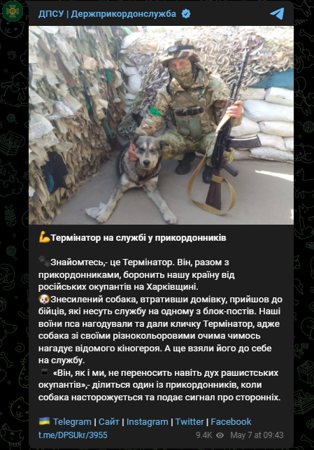"Наши воины пса накормили и дали кличку Терминатор, ведь собака со своими разноцветными глазами чем-то напоминает известного киногероя", – рассказывают пограничники.