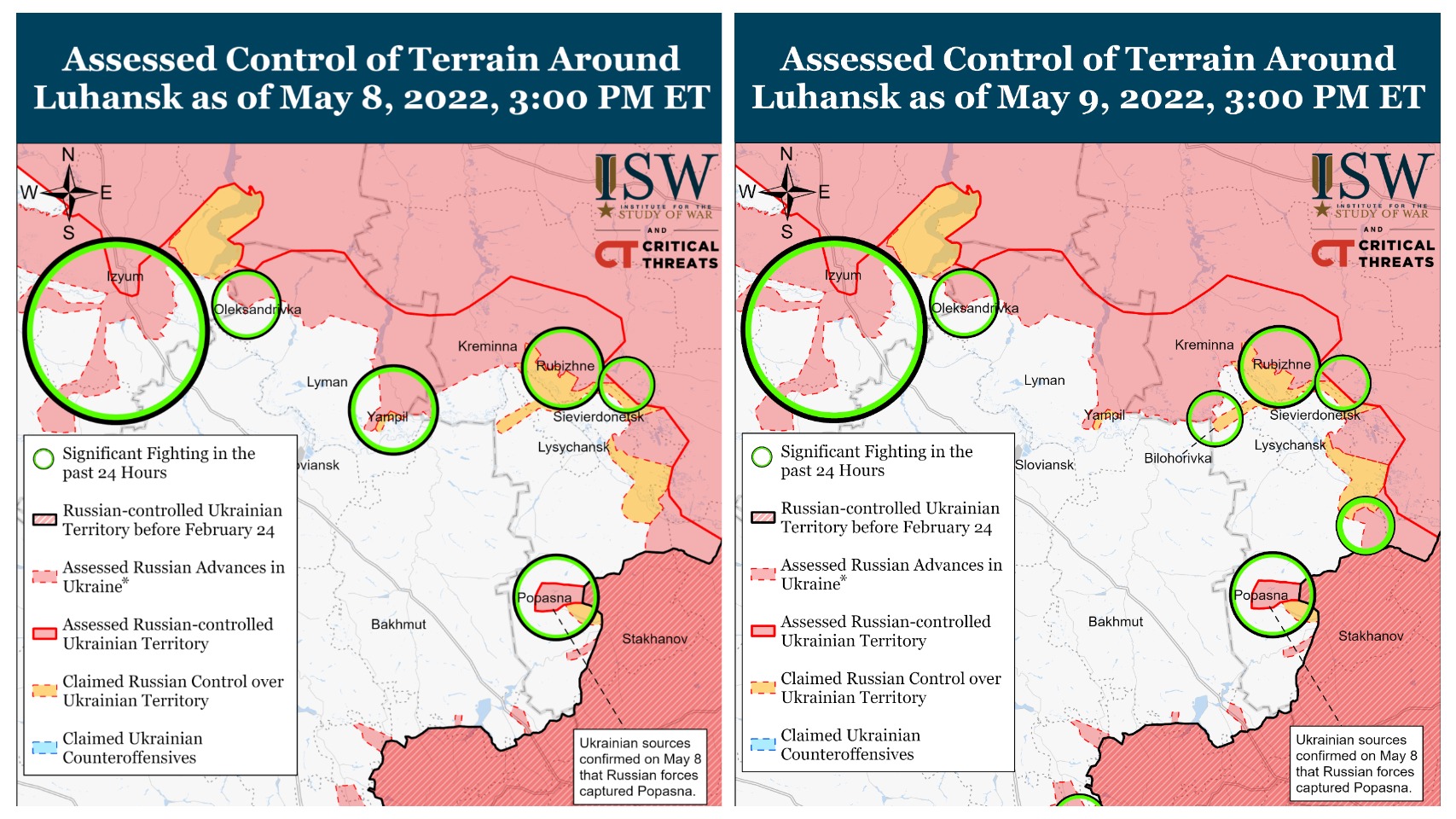 Если сравнить военные карты за 8 и 9 мая, составленные Институтом изучения войны (США), то мы увидим, что между Лиманом и Северодонецком Россия за прошедшие сутки расширила зону контроля в треугольнике Ямполь - Кременная - Белогоровка.