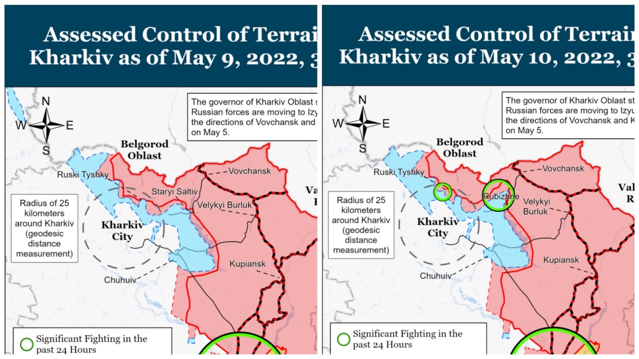 09:07 Сравнение военных карт по ситуации вокруг Харькова за 9 и 10 мая.