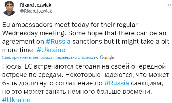 10:00 Сегодня представители стран ЕС сделают еще одну попытку договориться по новому пакету антироссийских санкций, сообщает журналист Рикард Йозвяк.