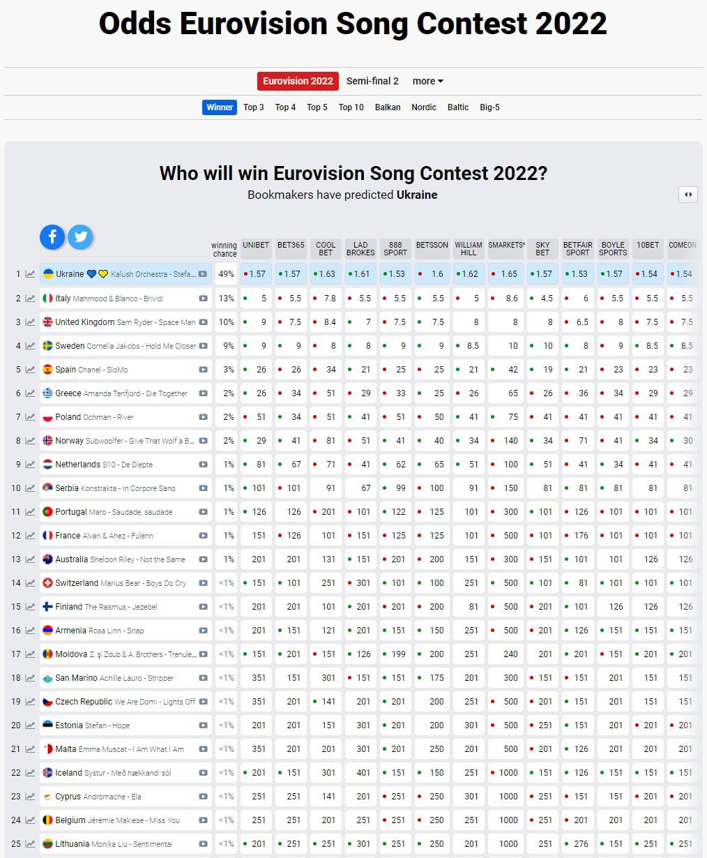 Данные букмекерских компаний опубликованы на сайте EurovisionWorld.