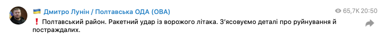 Губернатор Лунин сообщил об авиаударе в Полтавской области. Фото: facebook/Dmytro.Lunin