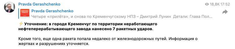 А советник главы МВД Антон Геращенко пишет, что по Кременчугскому НПЗ наносилось не четыре, а семь ударов. Одна ракета упала около железнодорожных путей.