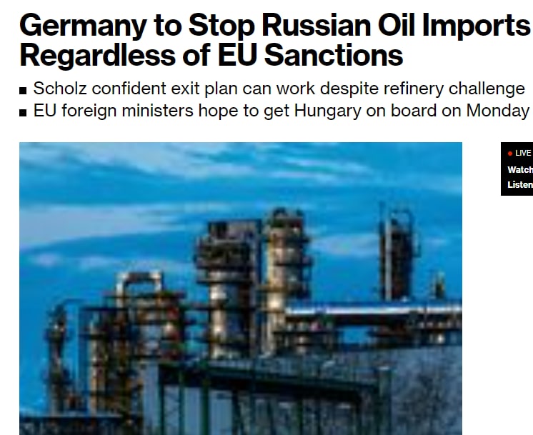 08:04 Германия до конца года откажется от российской нефти, даже если Евросоюз не сможет ввести эмбарго против РФ.